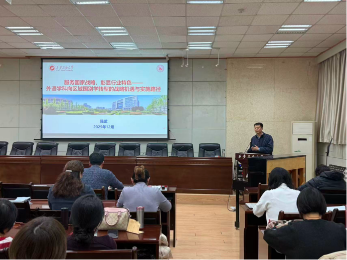 随后,副院长陈武做全院教学科研工作动员,并就“服务国家战略,彰显行业特色——外语学科向区域国别学转型的战略机遇与实施路径”进行专题报告。报告深入分析人工智能时代外语学科面临的挑战与机遇,明确指出在科技革新和国家战略需求升级的双重驱动下,外语学科须突破传统语言技能培养的局限,深化“外语+能源”复合型人才培养方向,寻求外语学科向区域国别学科的转型。他强调,学院将依托学校能源学科优势和“一带一路”区位特征,聚焦中亚、中东等能源富集区的国别区域研究,推动外语学科与能源、法律、国际传播等领域的深度融合,逐步构建起“学科为根、行业为体、战略为魂”的特色发展格局。