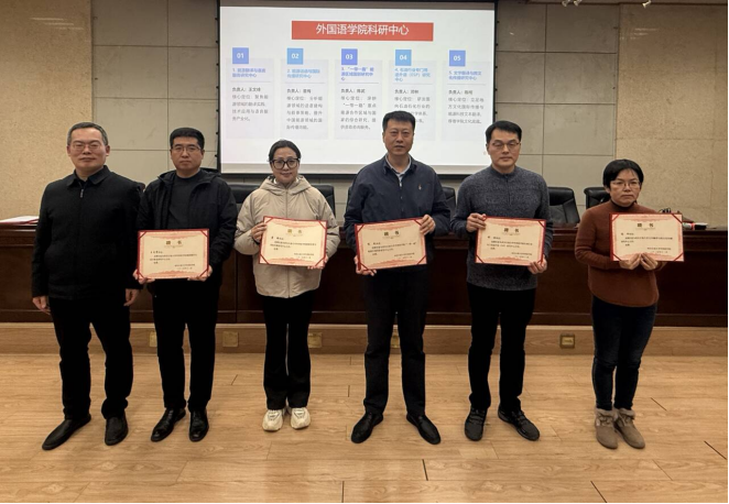 动员会后,学院隆重举行了五个特色研究中心的成立仪式。为精准对接国家战略与行业需求,系统构建“外语+能源”跨学科研究体系,学院正式成立能源翻译与语言服务研究中心、能源话语与国际传播研究中心、石油行业专门用途外语研究中心、“一带一路”能源区域国别研究中心及文学翻译与跨文化传播研究中心五个院设研究机构。会上,学院领导向五位研究中心主任现场颁发了聘书,标志着学院科研组织化、体系化建设迈入新阶段,为核心研究方向提供了实体平台支撑。