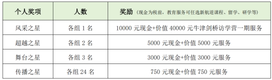 全国阶段奖项:所有参与的选手将被授予“中国故事精彩讲述者” 称号,并用个人奖项做差异区分排名第 1、排名第 2-3、排名第4-6,以及排名第 7-30 名的选手。